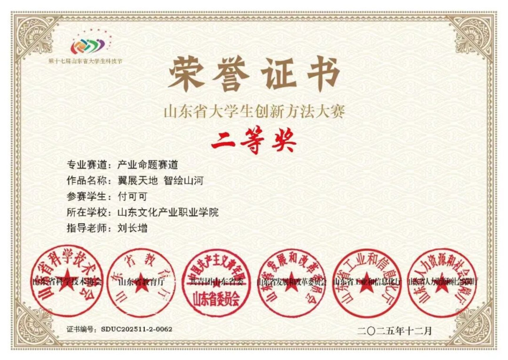 近日,在第十七届山东省大学生科技节“大学生创新方法大赛”中,山东文化产业职业学院师生表现卓越,脱颖而出,成功斩获省级二等奖2项、三等奖1项。这一优异成绩,充分彰显了我校在创新教育领域的扎实功底与丰硕成果。