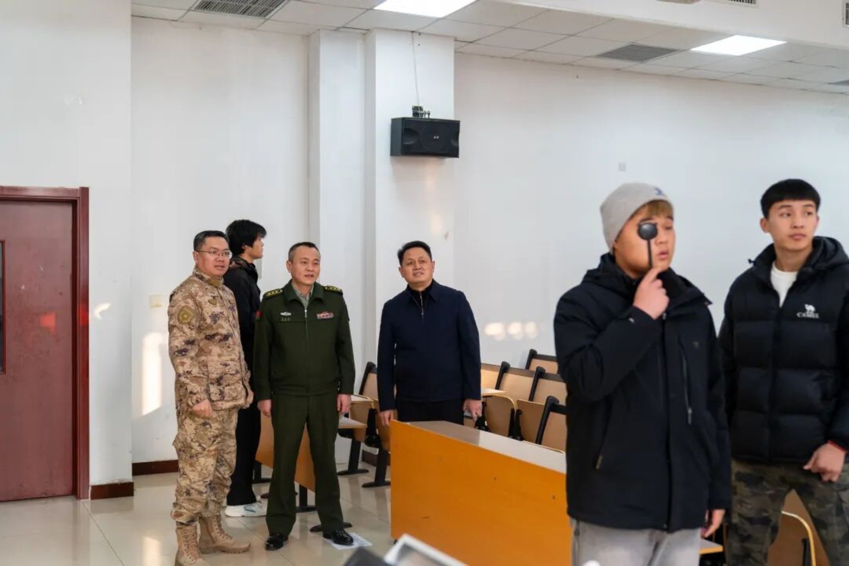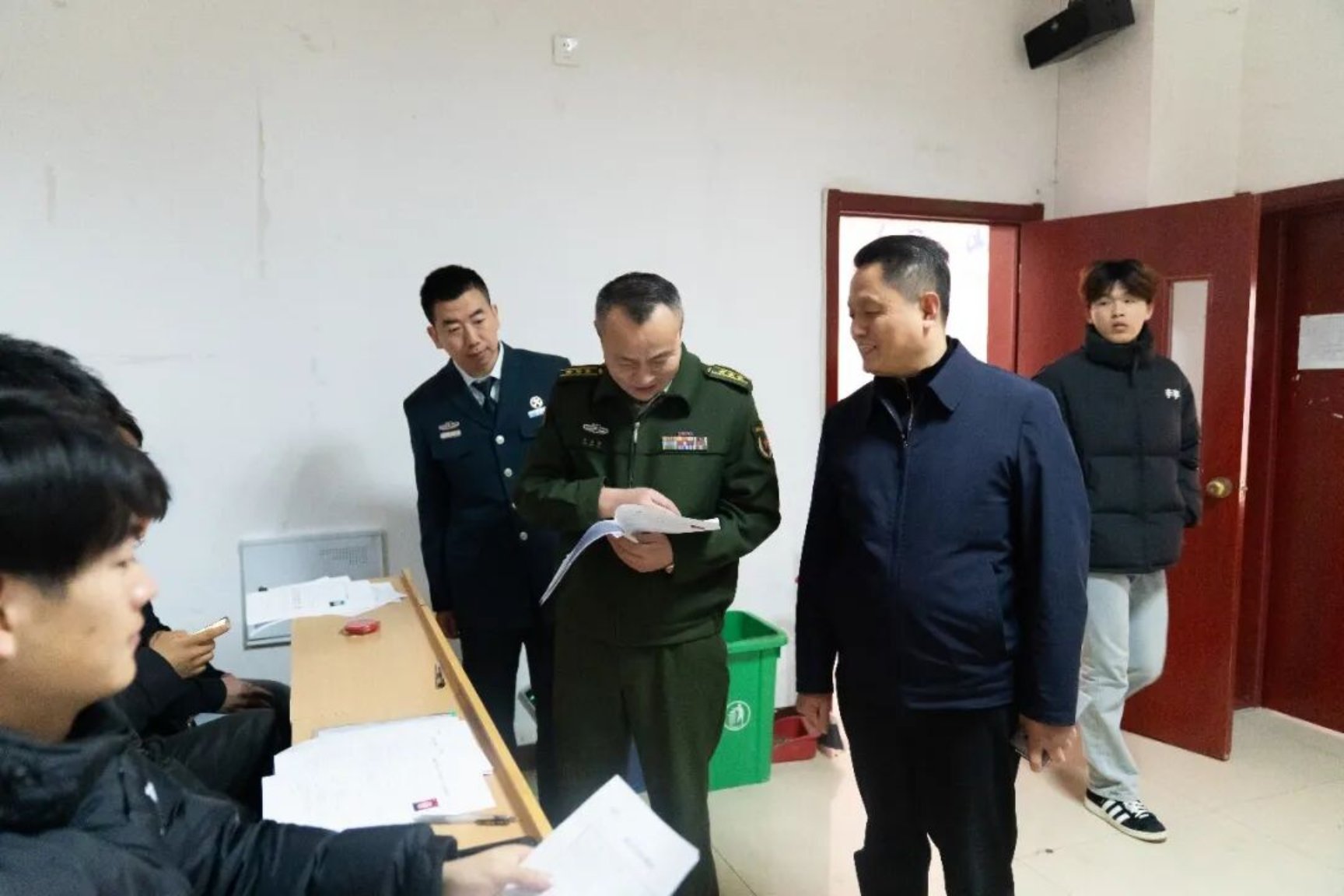 王庆涛、刘祚波一行深入体检现场,实地察看各环节工作开展情况,详细询问体检流程设计、人员配置及学生报名情况,并与待检学子亲切交流,勉励大家将个人理想融入国防建设,在军营大熔炉中淬炼成钢。