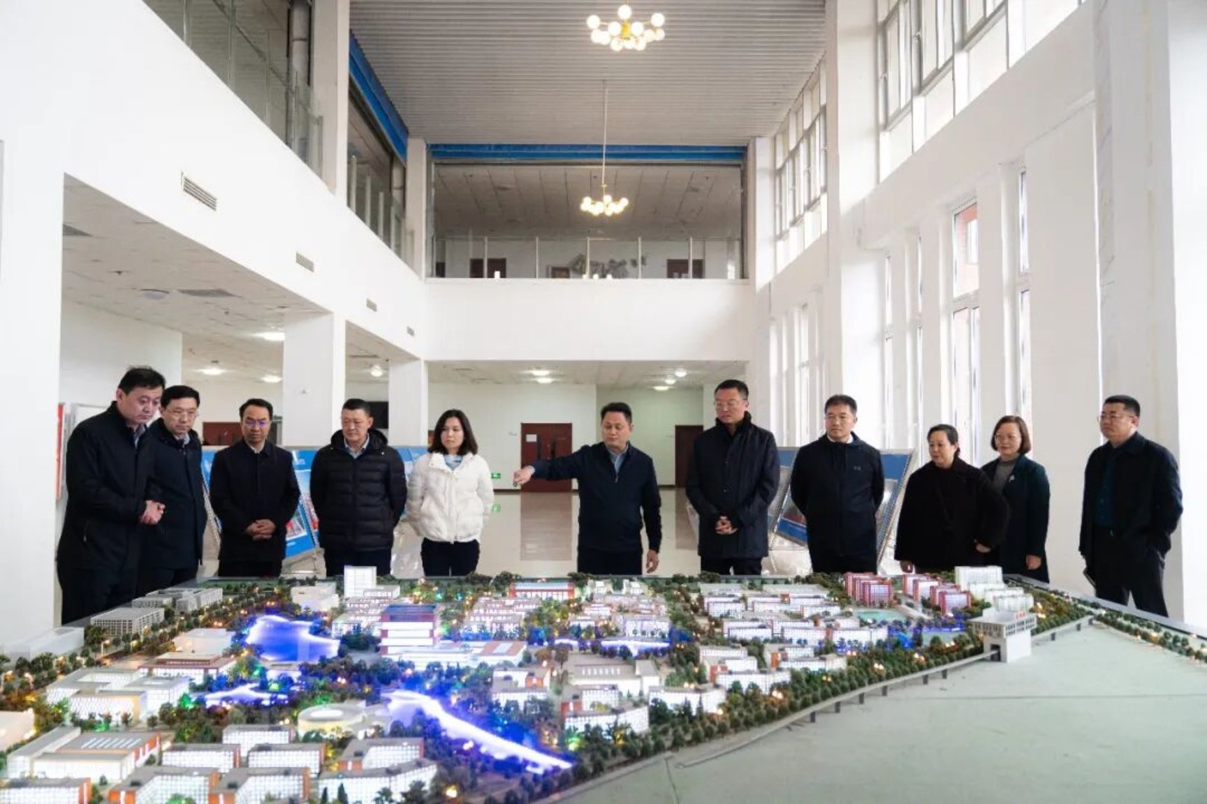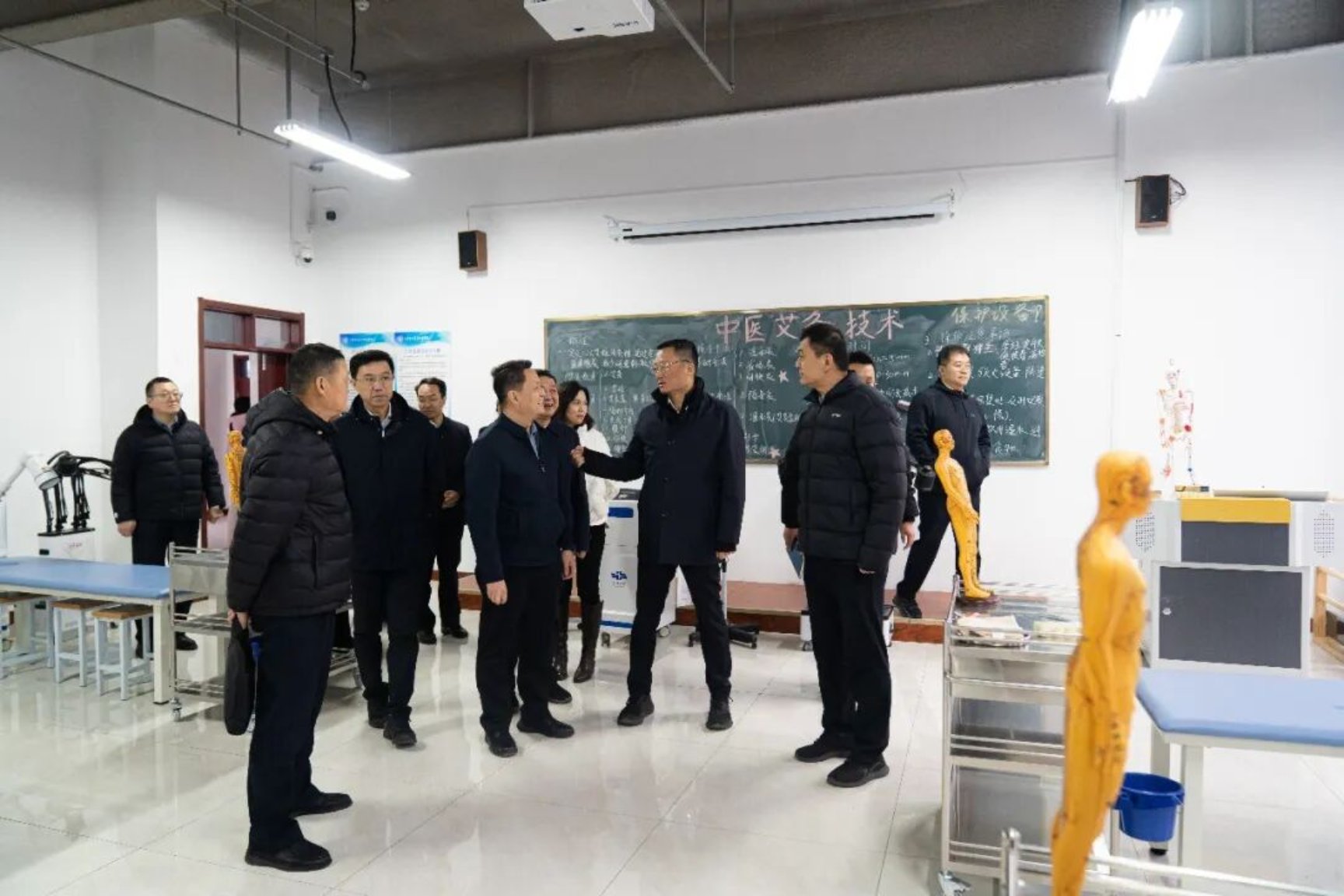 座谈前,江联军局长一行在董事长李京平的陪同下实地考察综合楼规划沙盘处,详细了解学校整体布局、基建规划及发展蓝图。沿途参观了人工湖、图书馆、桃李巷等校园景观,感受学校浓厚的文化氛围与优美的育人环境。调研组重点考察了医养健康学院实训室,实地查看了康复治疗、智慧康养等实训设施配置与教学开展情况,对学校产教融合的实训教学模式给予高度评价。