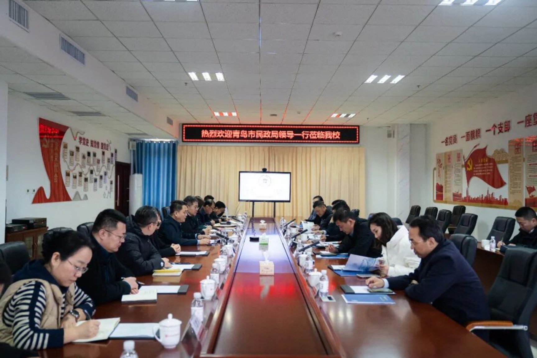 为深化政校合作,共促康养产业高质量发展,1月16日,青岛市民政局党组书记、局长江联军带领副局长张帅,党组成员、副局长杨建军及相关福利机构负责人一行7人莅临我校调研交流。莱西市经济开发区党工委书记、管委会主任褚方晓陪同调研。学校董事长李京平,党委书记田艳玲,副校长汪蓉樱,相关处室负责人热情接待并出席座谈。