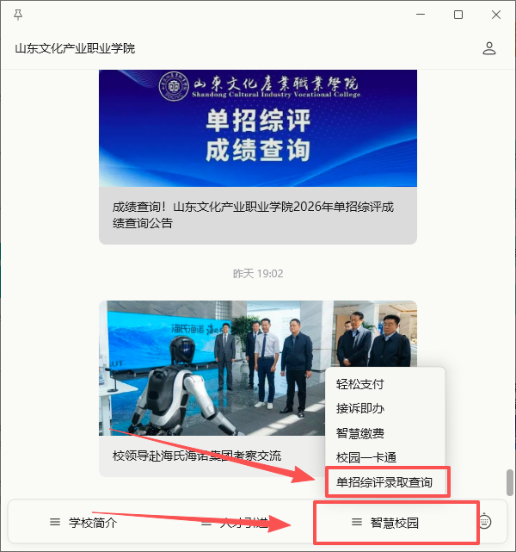 关注“山东文化产业职业学院”微信公众号--点击“智慧校园”--选择“单招综评录取查询”。