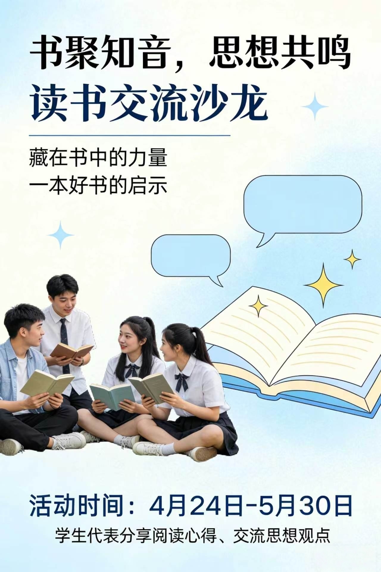 活动内容:以“藏在书中的力量”“一本好书的启示”等为主题,活动中分享阅读心得、讨论交流观点。