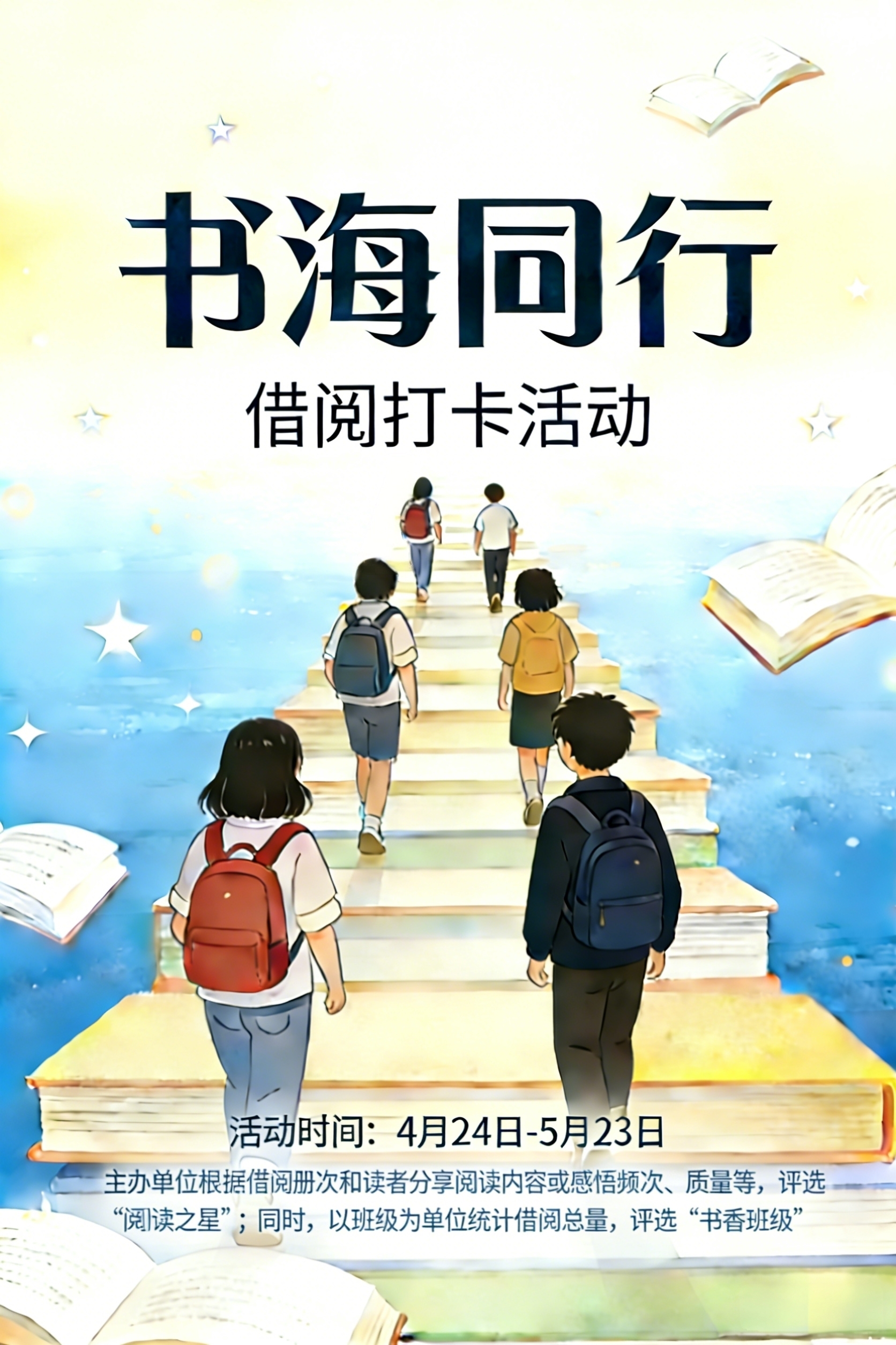5月底,图书馆根据借阅册次和读者分享阅读内容频次和质量等,评选“阅读之星”;以班级为单位统计借阅总量,评选“书香班级”并在图书馆网、学工驿站等张榜公布。