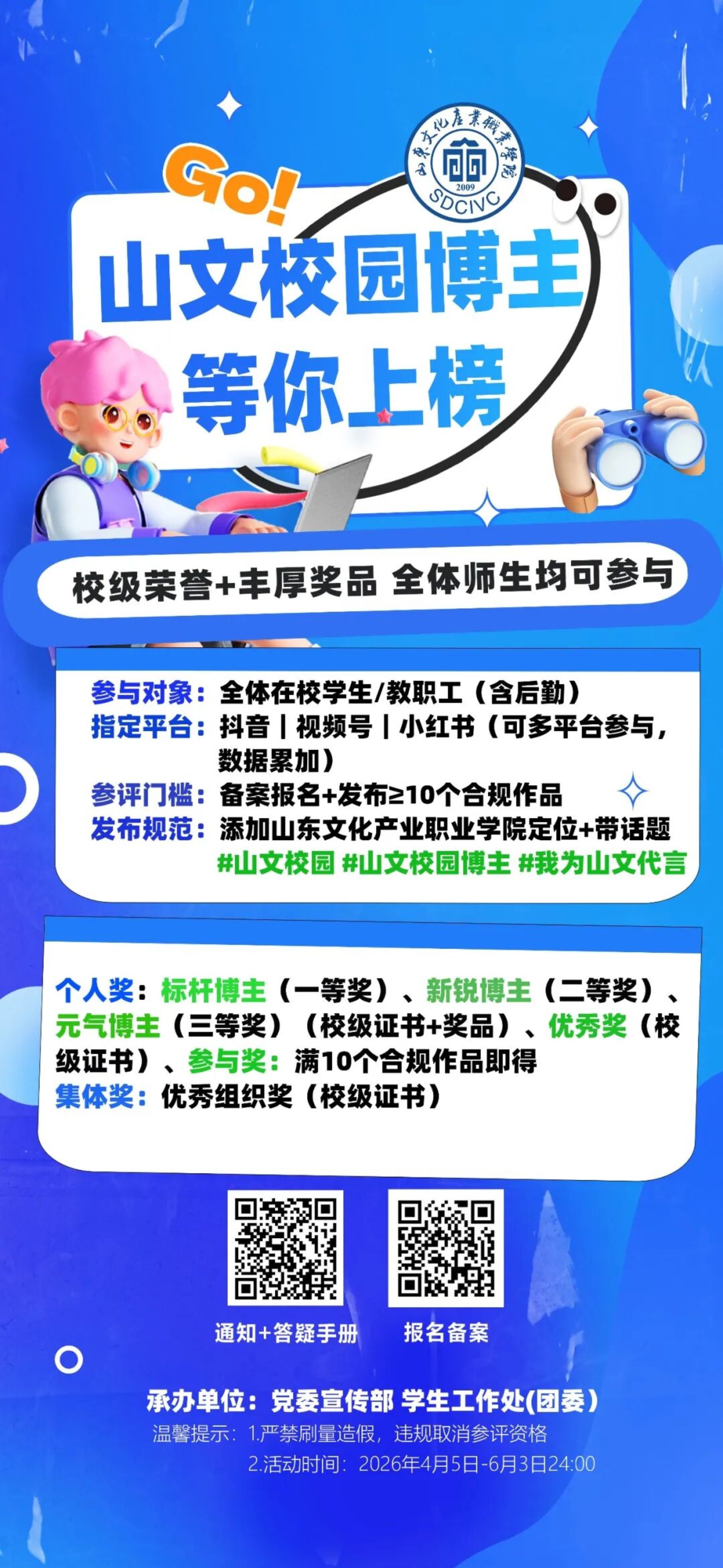 为展现山文校园风貌、师生风采,营造“人人爱校、人人宣校”的浓厚氛围,学校“山文校园博主 等你上榜”校园自媒体评选活动重磅开启!无论你是短视频创作达人,还是热爱记录校园的生活博主,只要你有创意,这里就是你的舞台!校级荣誉证书、丰厚奖品已备好,全体师生均可参与,下一个山文校园博主就是你!
