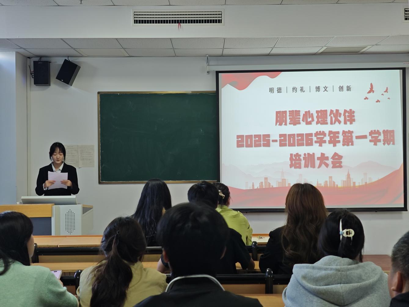 2025年10月14日,朋辈心理伙伴培训会在博文楼309教室顺利举行。本次会议由杜田雨主持,心理健康中心李宗蔚、张钰老师出席,朋辈心理伙伴全体成员参加。