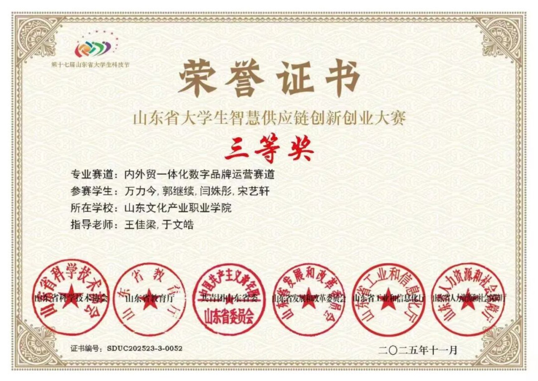 近日,第十七届山东省大学生科技节“智慧供应链创新创业大赛”总决赛圆满落幕。我校工商管理学院派出的3支代表队,与来自省内外74所高校的242支队伍同台竞技,经过激烈角逐,最终荣获省级二等奖2项、三等奖1项,充分展现了山文学子扎实的专业素养、创新的思维与出色的团队协作能力。获奖名单如下: