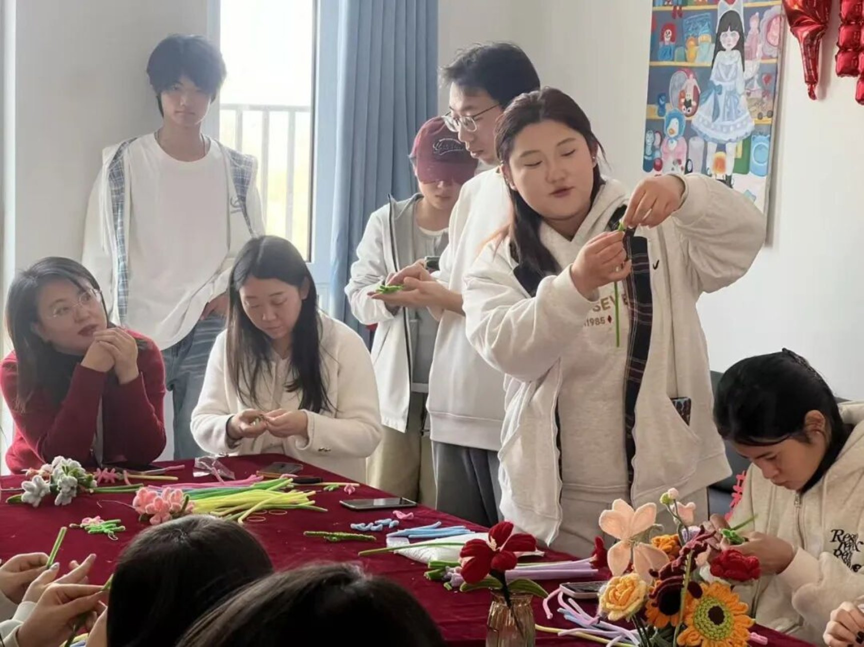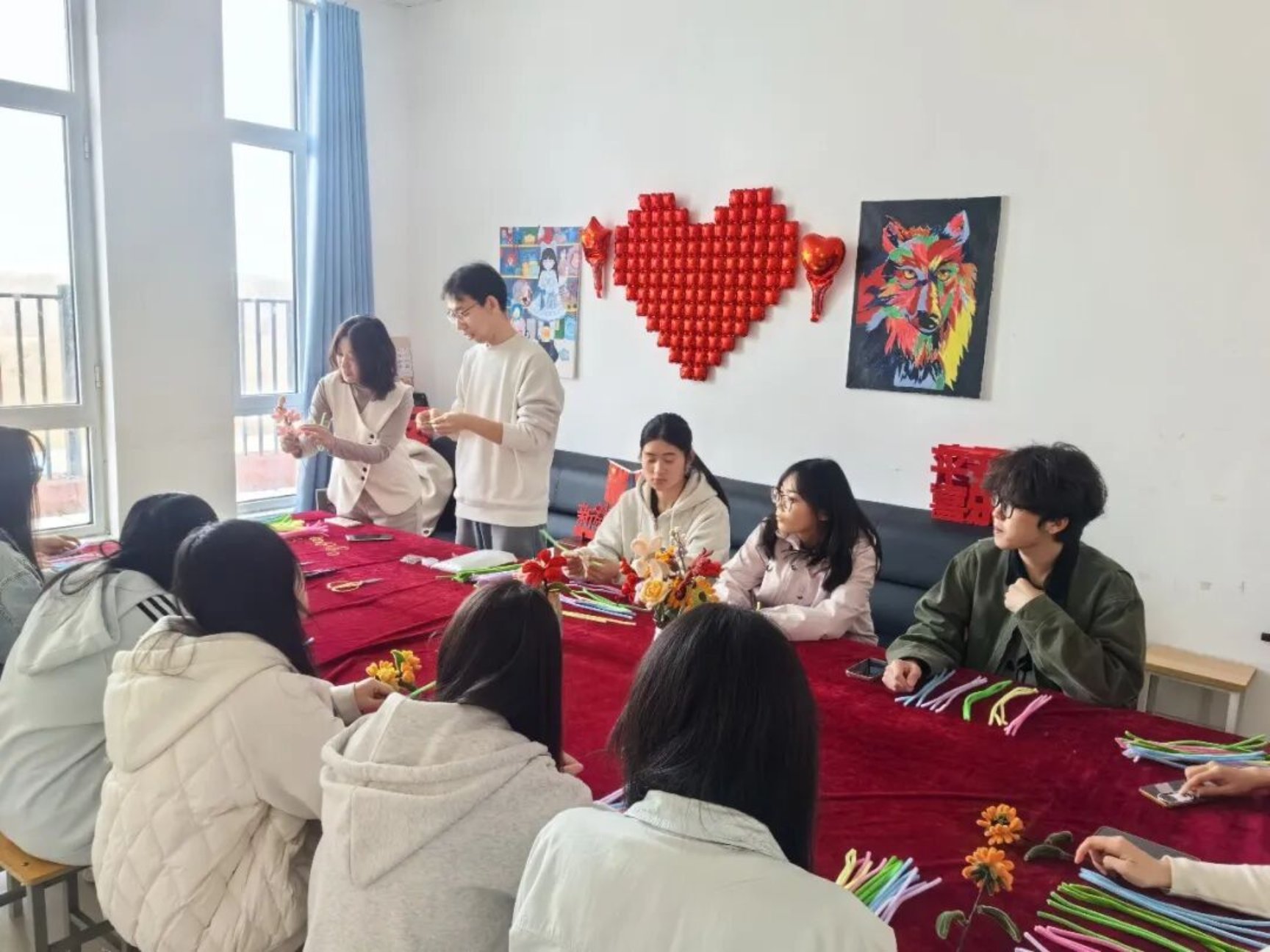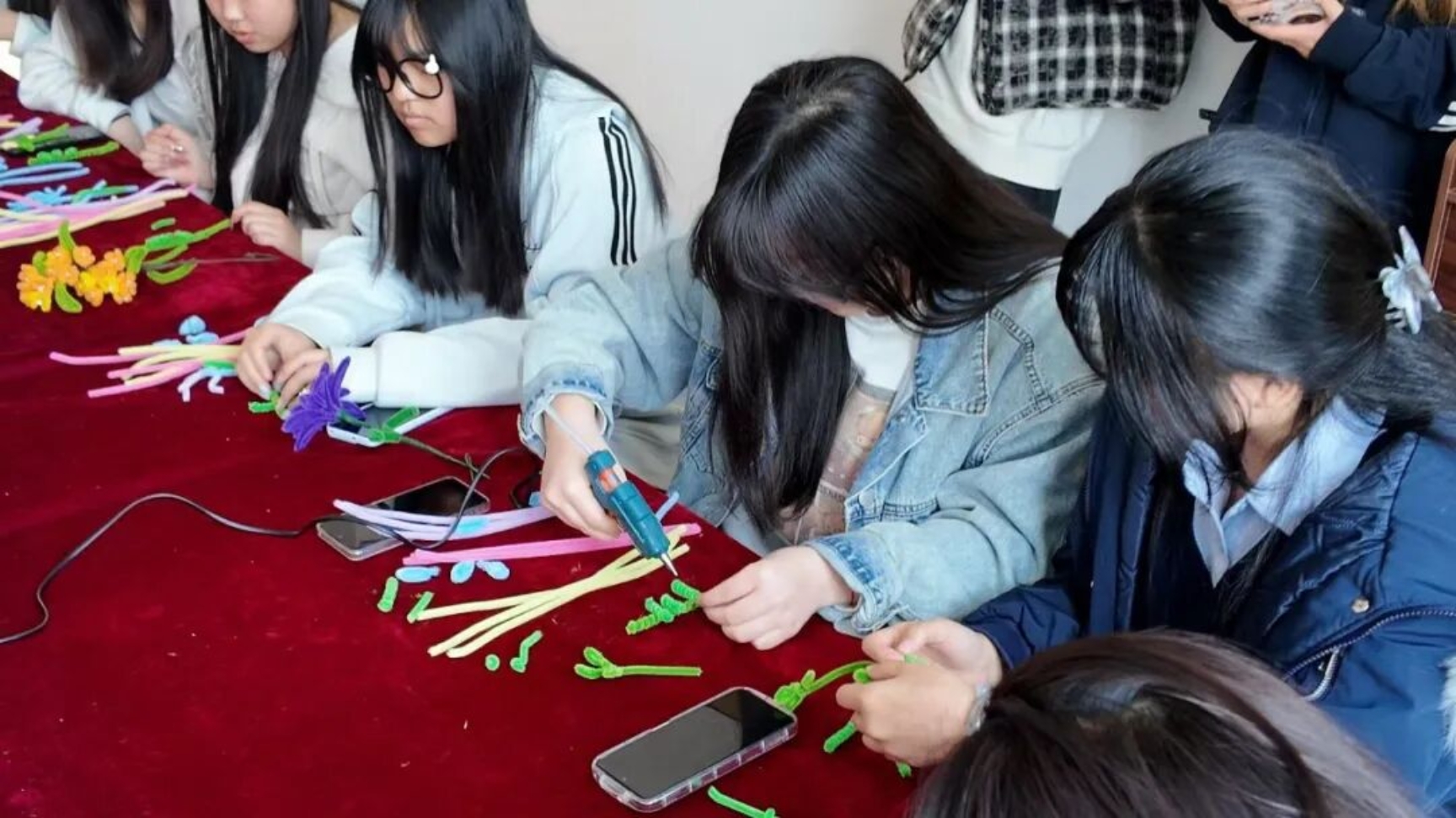 “先把扭扭棒对折拧成螺旋状,作为花瓣的基础,再用绿色扭扭棒做花茎,慢慢调整弧度就会很灵动~”学长学姐们手把手教学,从基础造型到创意搭配,细致解答同学们的每一个疑问,温柔又有耐心。遇到动手较慢的同学,学长学姐们俯身指导,双方同学之间也相互帮忙、彼此借鉴,原本陌生的距离在指尖的互动中悄然拉近。