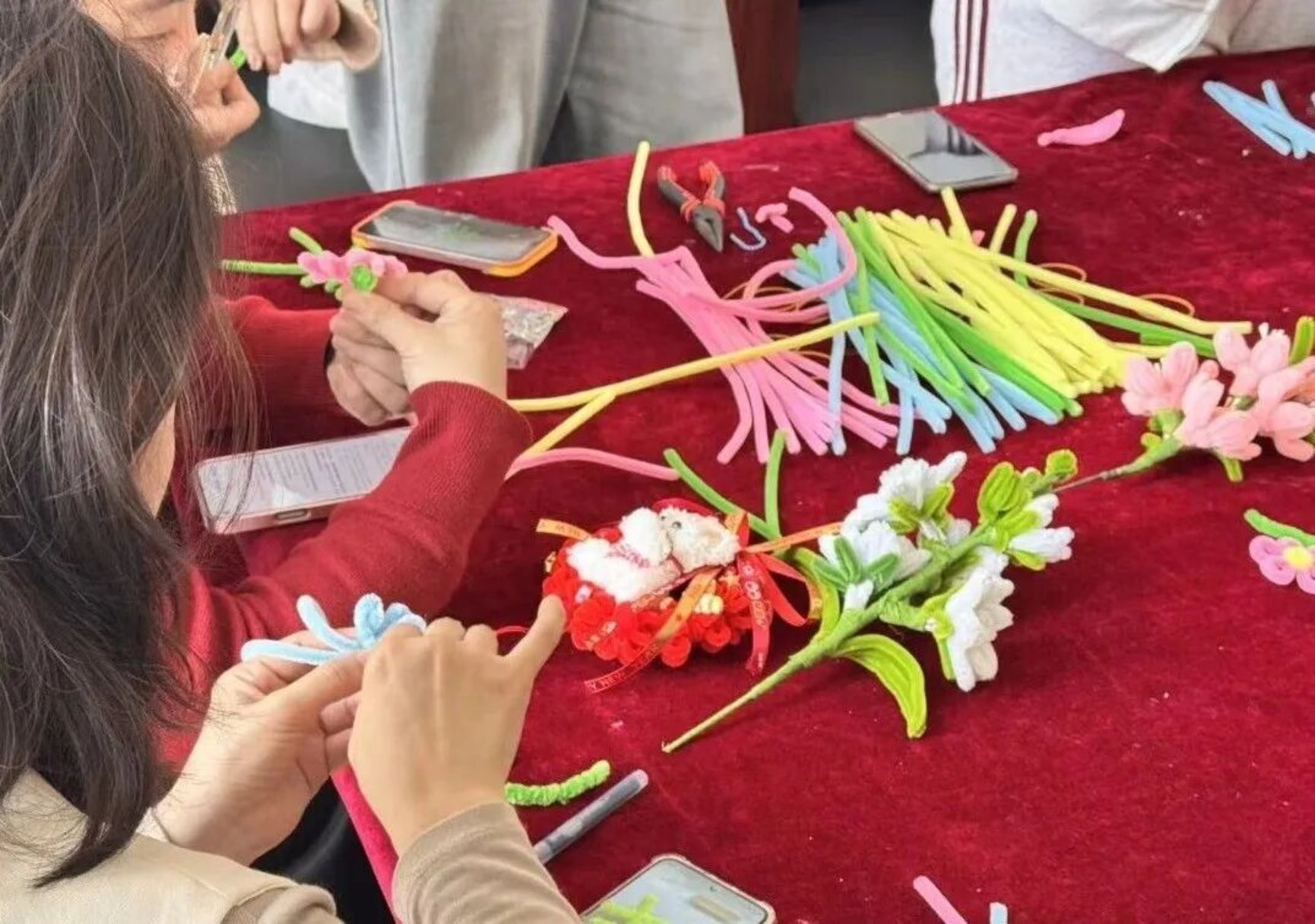 活动的核心的是“共同完成”,同学们打破学院界限,自由组队,分工协作,有的负责构思整体造型,有的专注于细节拼接,有的忙着搭配色彩。大家各展所长,奇思妙想不断迸发:有的小组合力制作出春日主题摆件,粉嫩的花朵等,每一个造型都充满童趣与创意;有的小组携手打造出创意挂饰,将扭扭棒与装饰配件结合,兼具美观与实用性;还有的小组发挥美术专业优势,将色彩搭配与造型设计完美融合,做出了极具艺术感的作品。