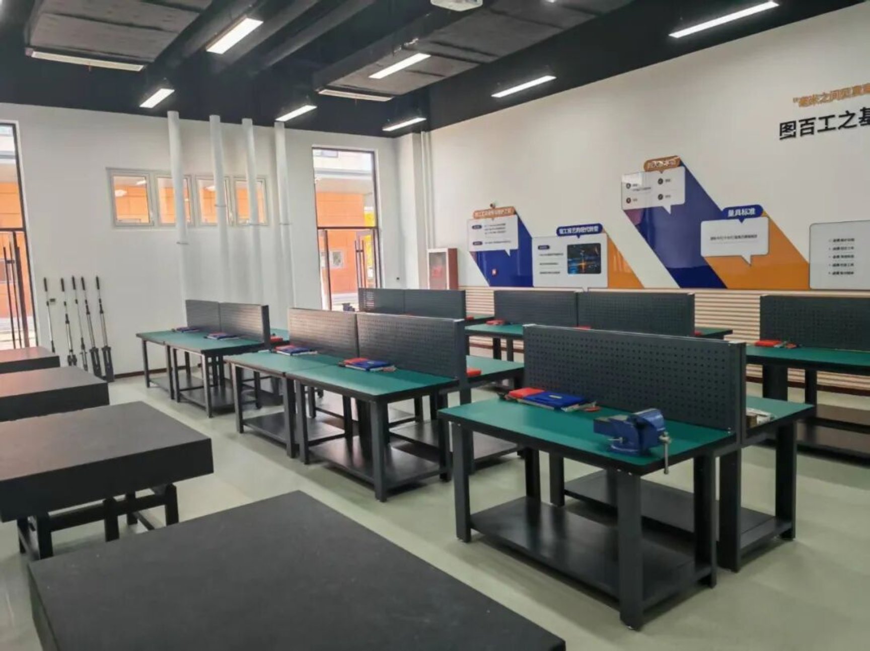 实训室设备规范齐全,覆盖钳工技能从基础实操到进阶锤炼的全流程培育,配备整齐的钳工工作台,以锉刀、手锯等“钳工五大件”为核心实训设备,为技能实训提供坚实保障。