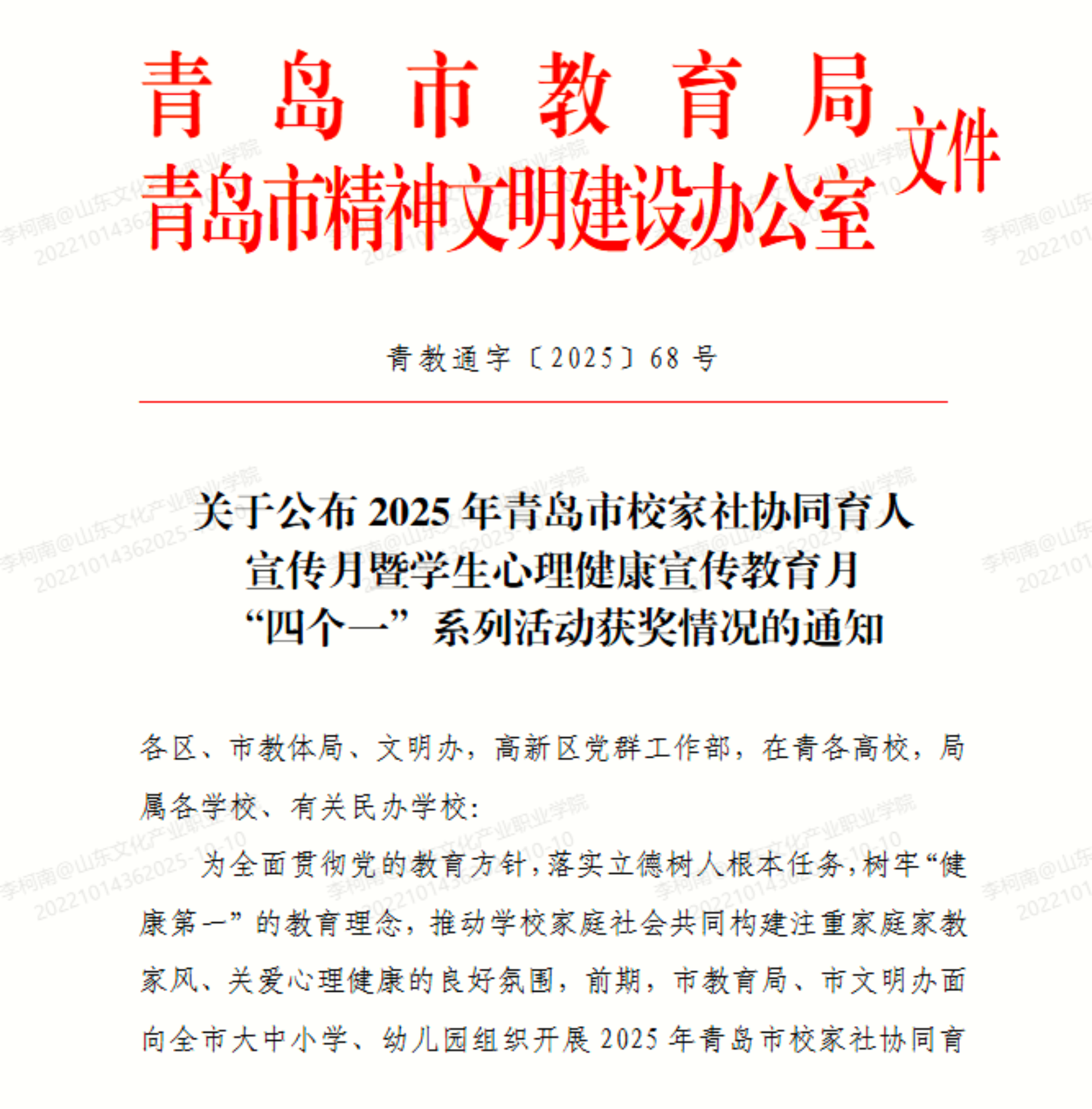 近日,在青岛市教育局与青岛市精神文明建设办公室联合开展的2025年青岛市校家社协同育人宣传月暨学生心理健康宣传教育月“四个一”系列活动评选中,我校师生精心准备、积极参与,报送的作品在众多参赛单位中脱颖而出,最终荣获一等奖1项、三等奖3项的优异成绩。这一佳绩集中体现了我校在推动学校、家庭、社会协同育人机制建设,以及普及心理健康知识、提升学生心理素养方面的积极探索和丰硕成果。