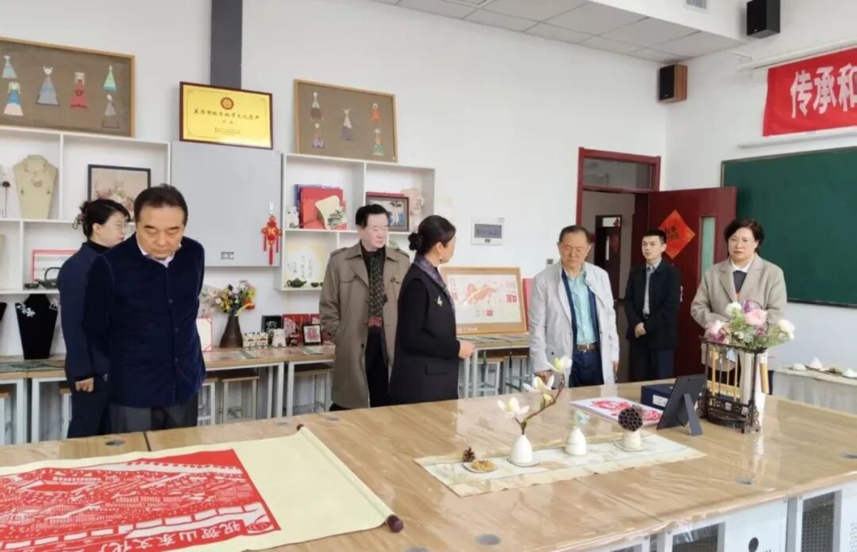 讲座开始前,美术与艺术设计学院院长钱品辉陪同杜晓帆教授、王虎博士、史丽珍博士参观了学院无党派人士王雪莲工作室。在工作室现场,大家详细了解了工作室在非遗传承、艺术创作、人才培养等方面的成果与实践。