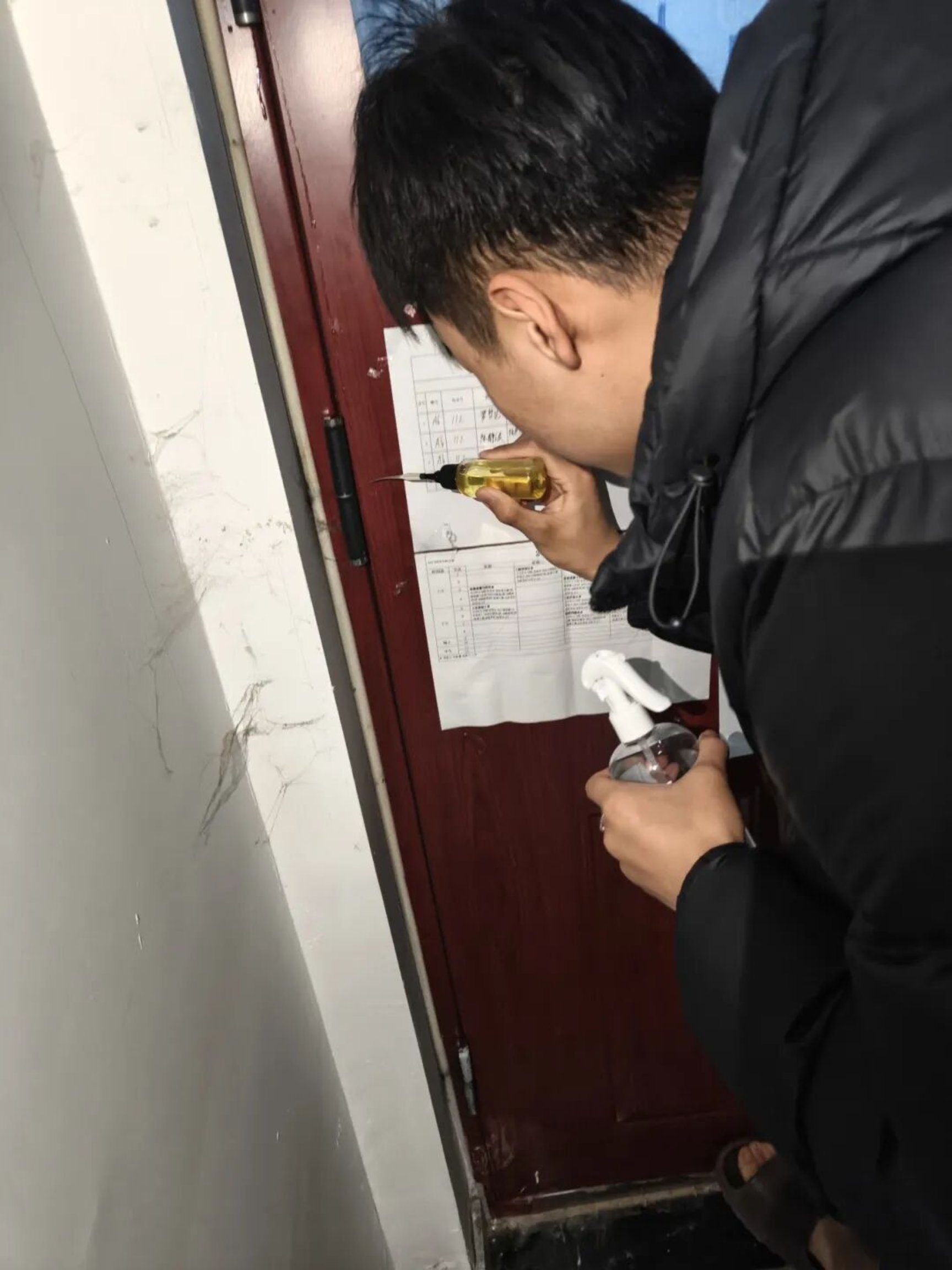 走访过程中,学生干部们化身“便民小使者”,带着提前准备好的润滑油、抹布等工具,逐间宿舍敲门问候。“同学,你们宿舍的门开关会不会有异响呀?我们来帮你滴点润滑油~”“抽屉推拉费劲吗?让我们检查一下!”亲切的问候瞬间拉近了距离。