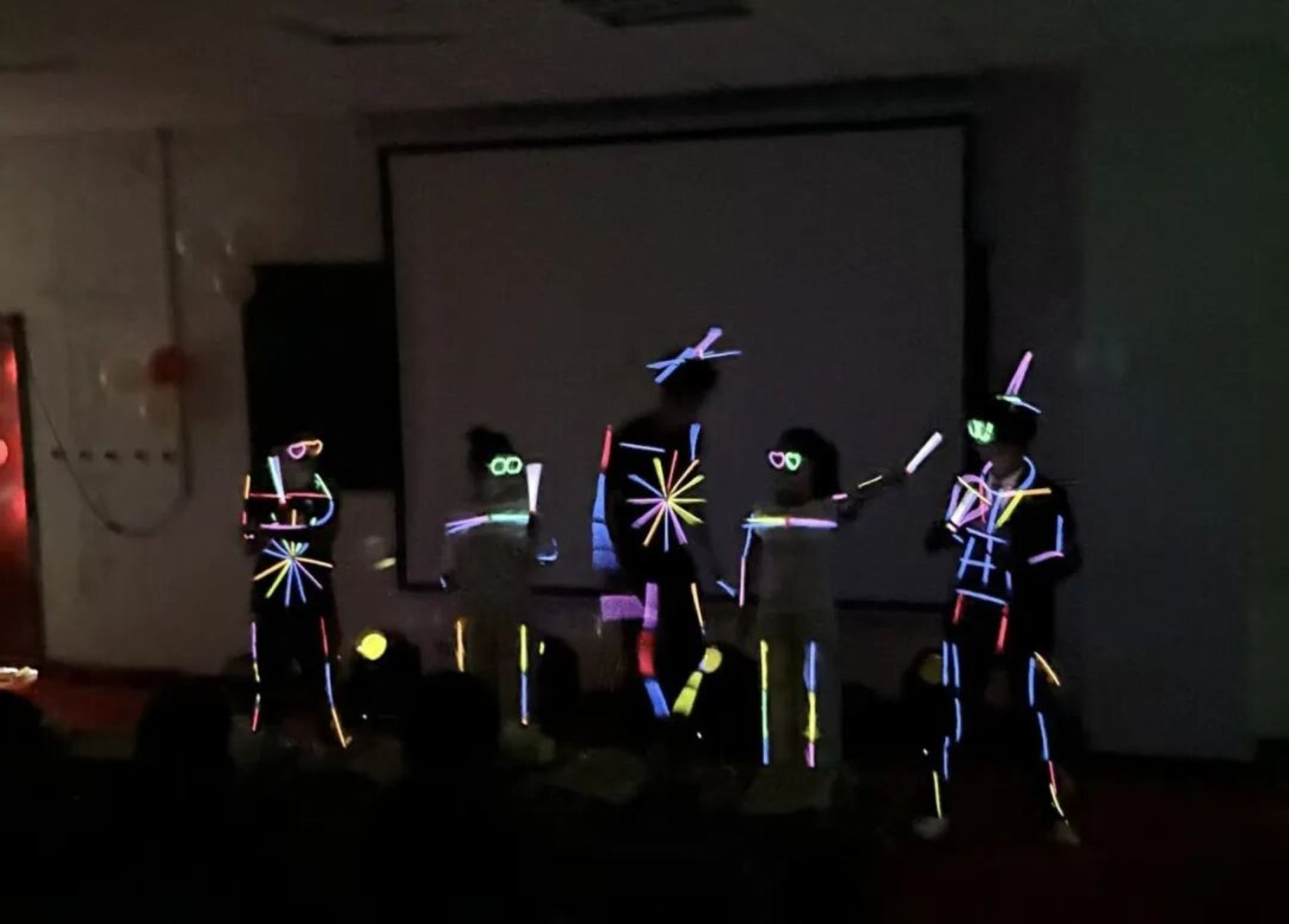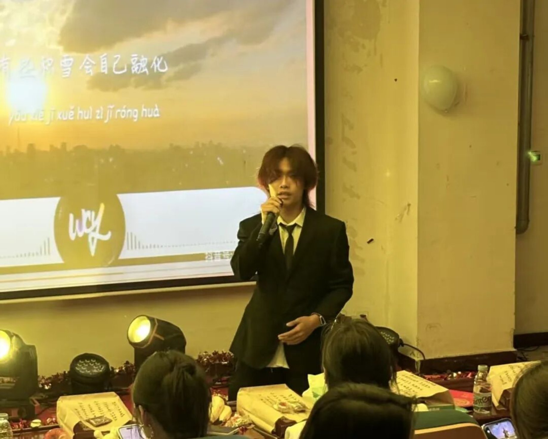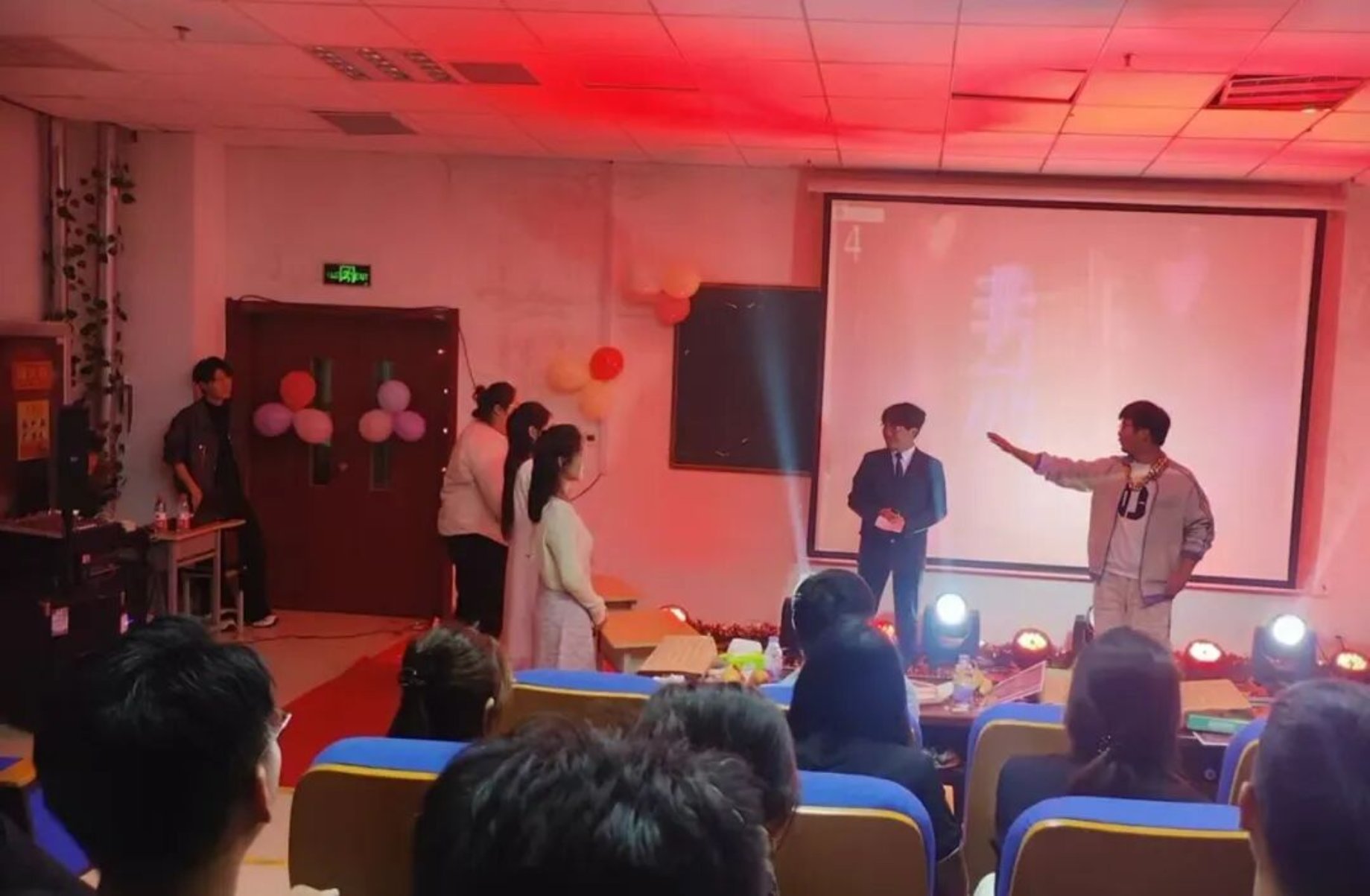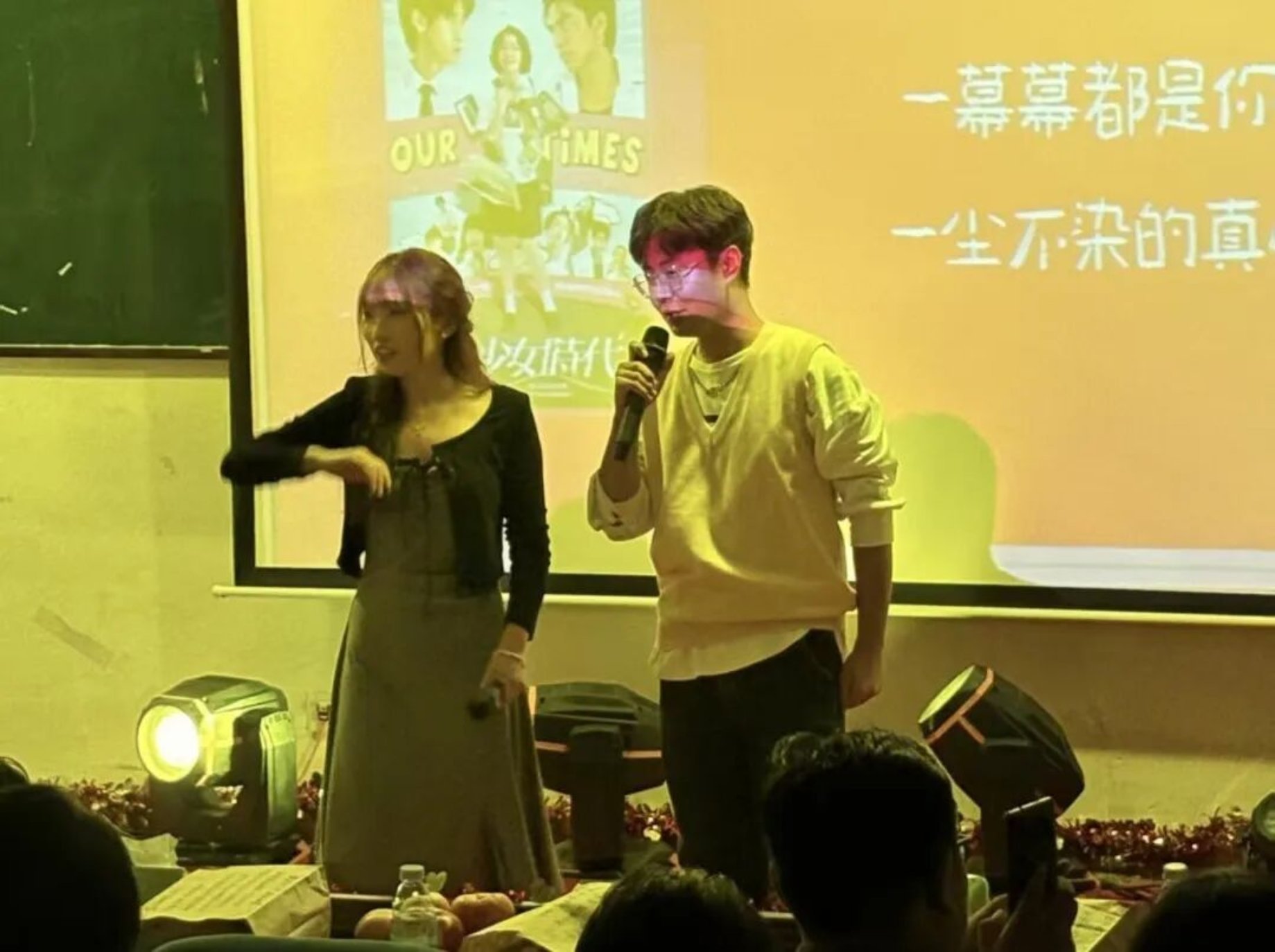 晚上六点半,教室内早已座无虚席。舞台四周点缀着闪烁的“星辰”,营造出浪漫温馨的中秋氛围。在观众的热烈期待中,主持人们闪亮登场,宣布晚会正式开始。