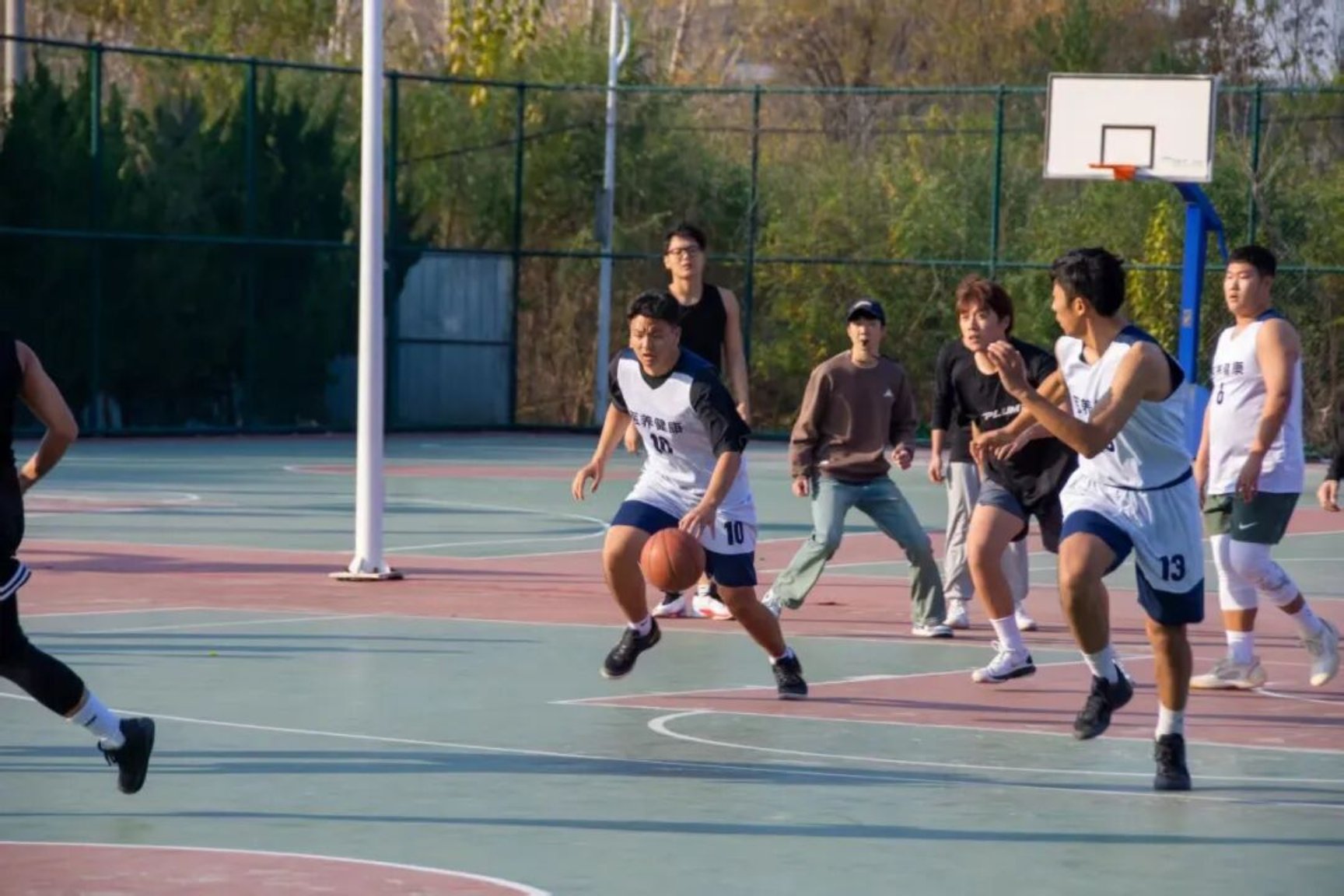 哨声一响,球员们瞬间进入状态。球员们如离弦之箭般冲向赛场,运球、突破、传球、投篮,一系列动作行云流水。持球者压低重心,目光快速扫过全场,在防守队员的围堵下灵活变向,脚步轻快如蝶,队友则默契跑位,或穿插掩护,或拉开空间,用精准的跑位为队友创造机会。