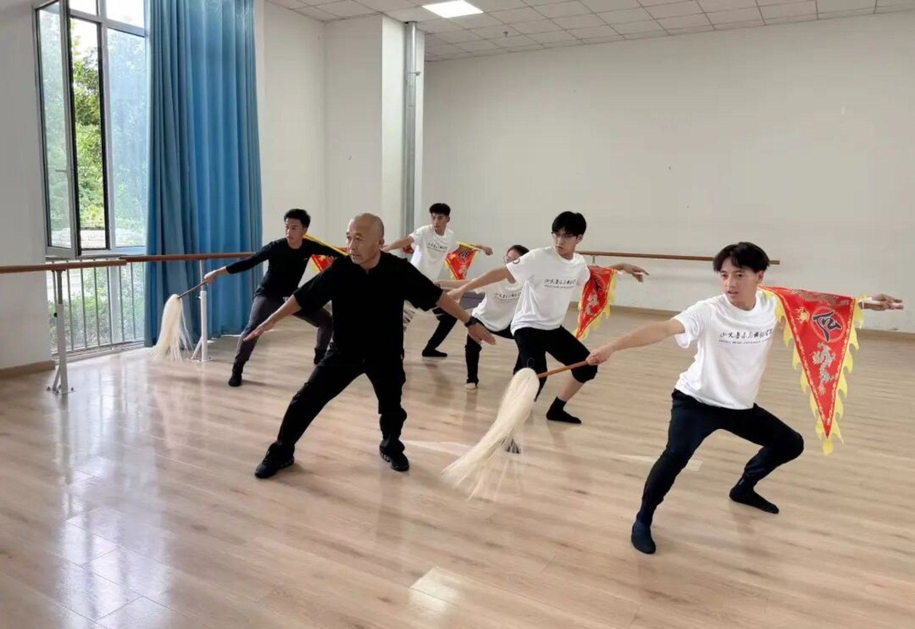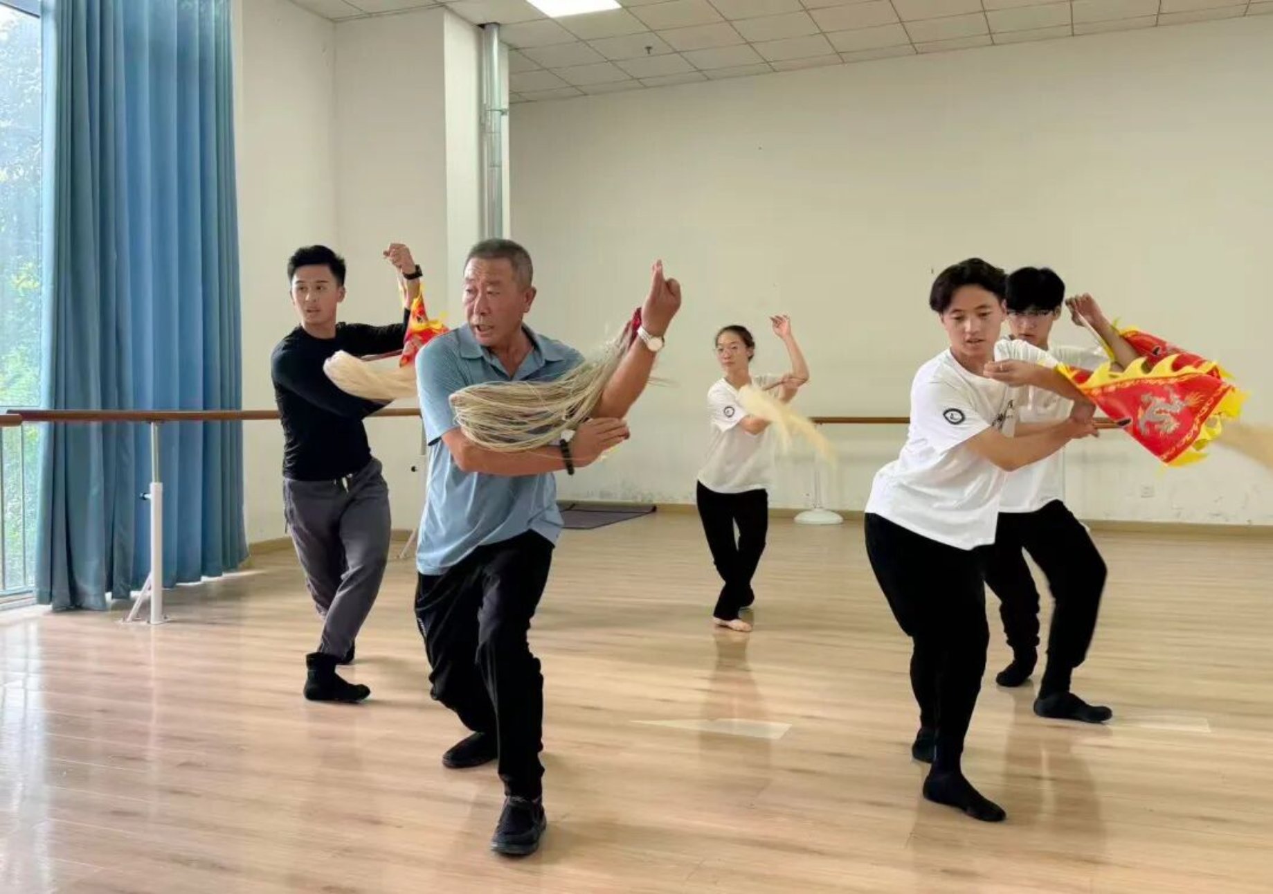 另一边,扮演“乐大夫”的师生们也都在认真揣摩角色精髓。同学们始终牢记老师的话:“眼睛要有神,让观众感受到你的状态和热情,做动作不要飘,要自信,放开了做,细节很重要。”