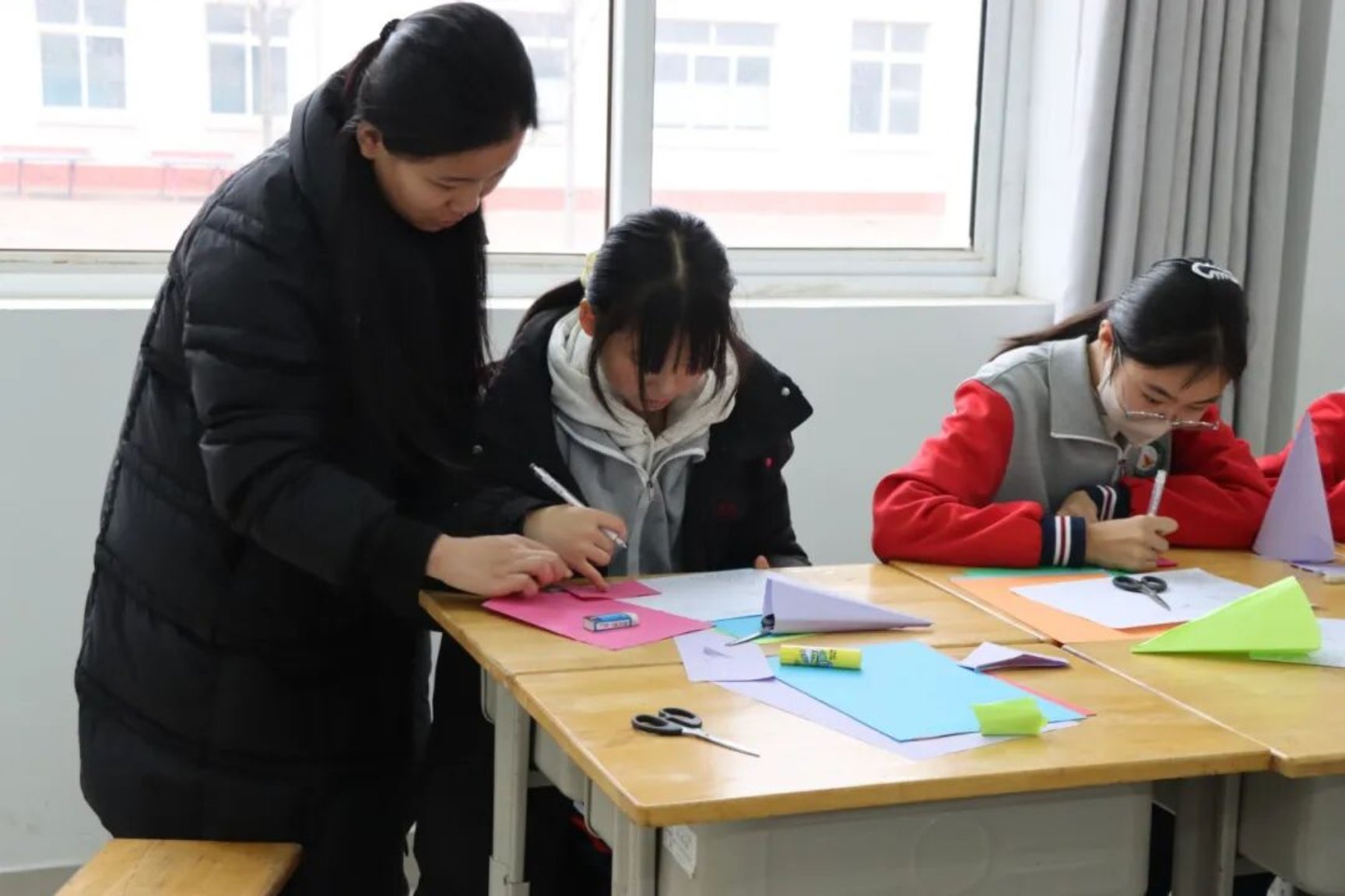 在随后的实践环节,山东文化产业职业学院艺术设计专业的刘芳老师,与该校24级艺术设计一班、工艺美术品设计一班的4位同学一同化身“非遗助教”,耐心指导中学生们折纸、画样、运剪。剪刀在中学生们的手中灵活穿梭,一张张饱含民族特色的剪纸图案逐渐成型。大家全神贯注,在一次次尝试中感受指尖创造美的喜悦,更体会着耐心与专注的“工匠精神”。许多孩子兴奋地表示,这是他们第一次接触达斡尔族文化,感觉“既新奇又亲切”。