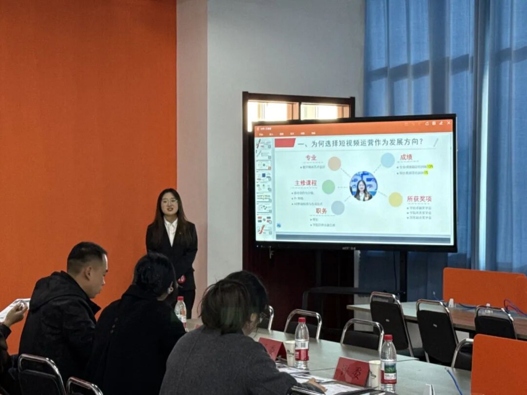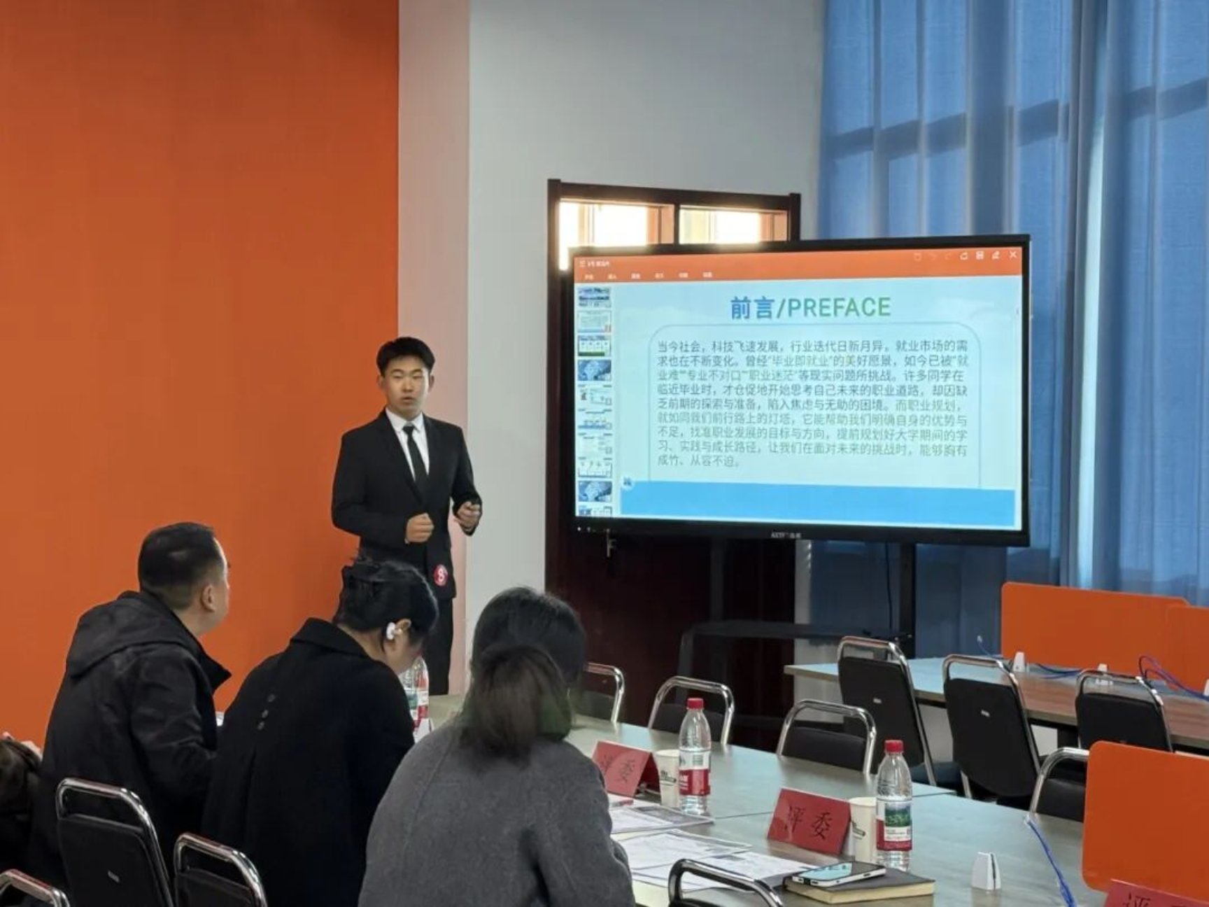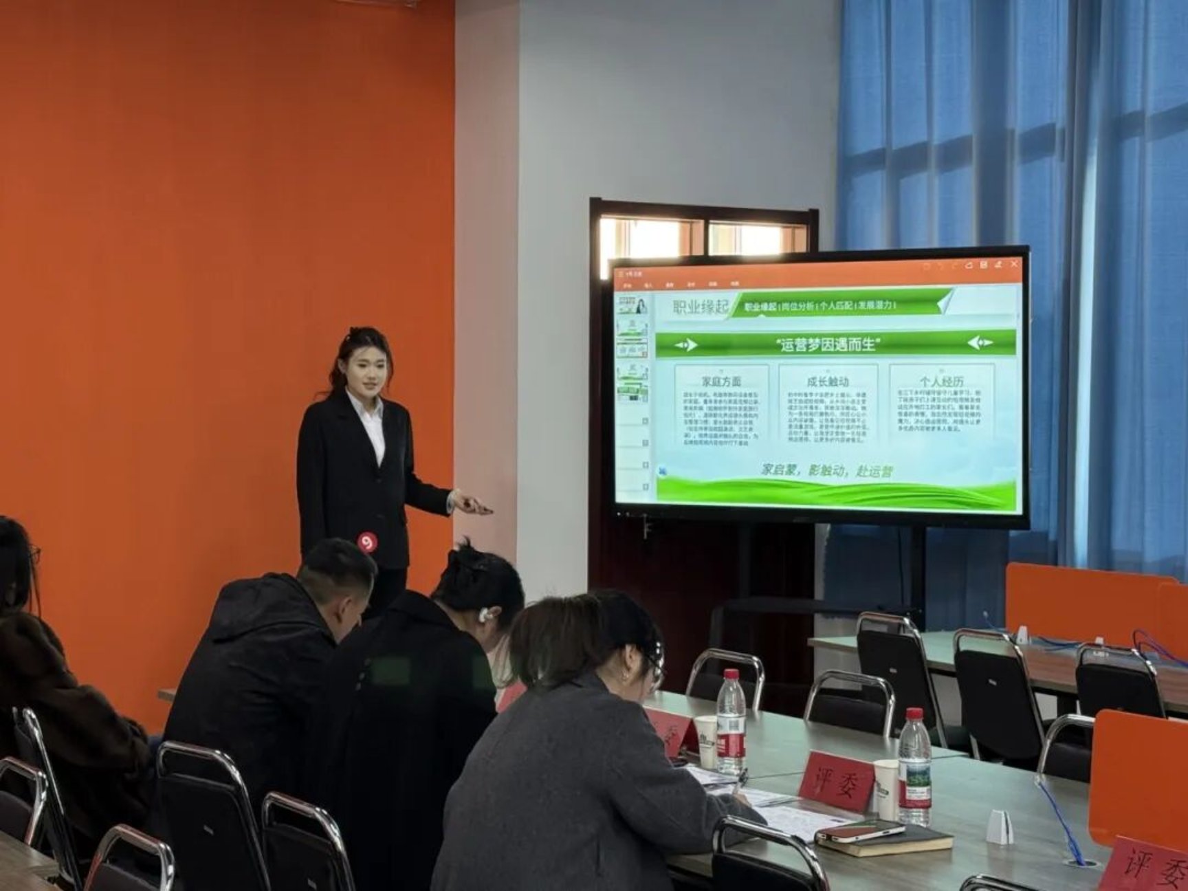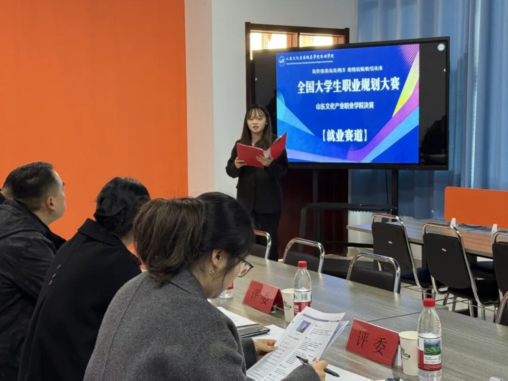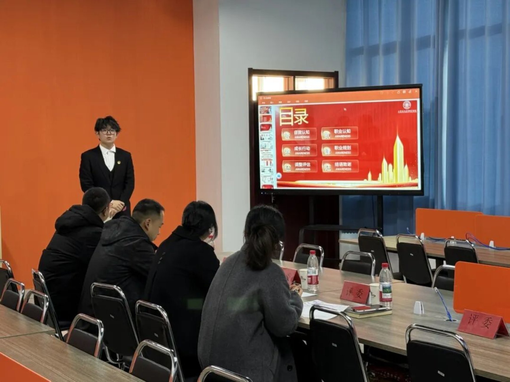 第三届全国大学生职业规划大赛就业赛道校内决赛近日在我校实训楼2306教室圆满落幕。本次大赛特邀传媒学院院长王艳、学生工作办公室副主任王峰、传媒学院院长助理胡晓洁,以及青岛金鸿人力资源服务有限公司运营总经理蔡总组成权威评审阵容,共同见证选手们在职业规划舞台上的思考、成长与绽放。