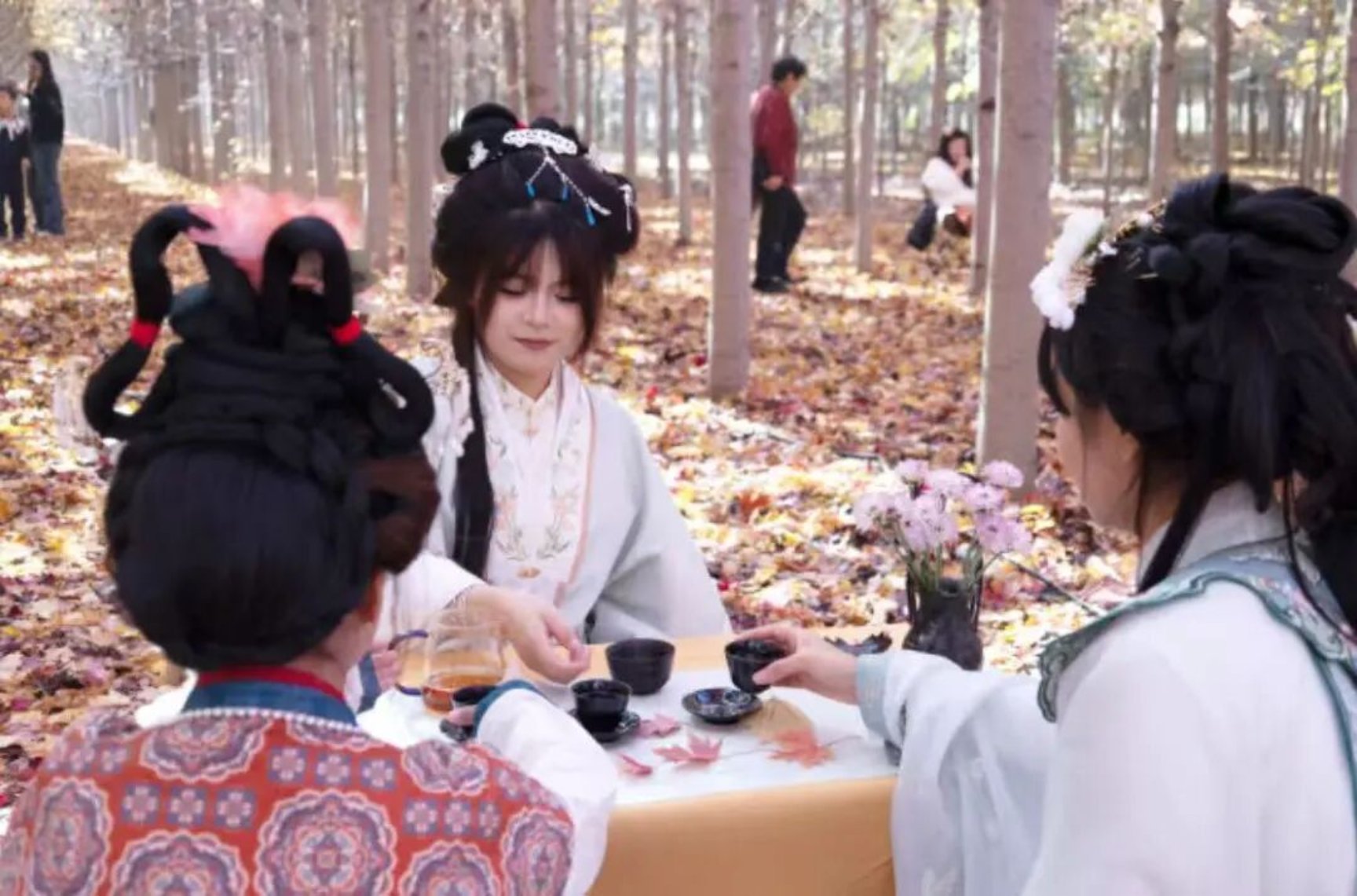 在拓印体验区,他们手持鬃刷,耐心指导游客将枫叶纹样、传统吉祥图案拓印在宣纸或帆布包上,从油墨调配到拓印力度把控,手把手传递传统工艺技巧;枫香茶肆内,学子们则遵循传统茶艺流程,温杯、置茶、注水、分茶,动作行云流水,同时向围坐的游客讲解莱西本地茶文化渊源,邀请大家闭眼品茶香、听枫声,感受“茶与枫”的自然交融。“在指导游客拓印时,有小朋友说‘原来树叶也能变成画’,这种对传统文化的好奇让我很有成就感,也让我更懂如何用大众易懂的方式传播非选。”参与活动的学生代表说道,非遗文化中的纹样、技艺,也为后续传统工艺创新设计课程积累了真实案例。
