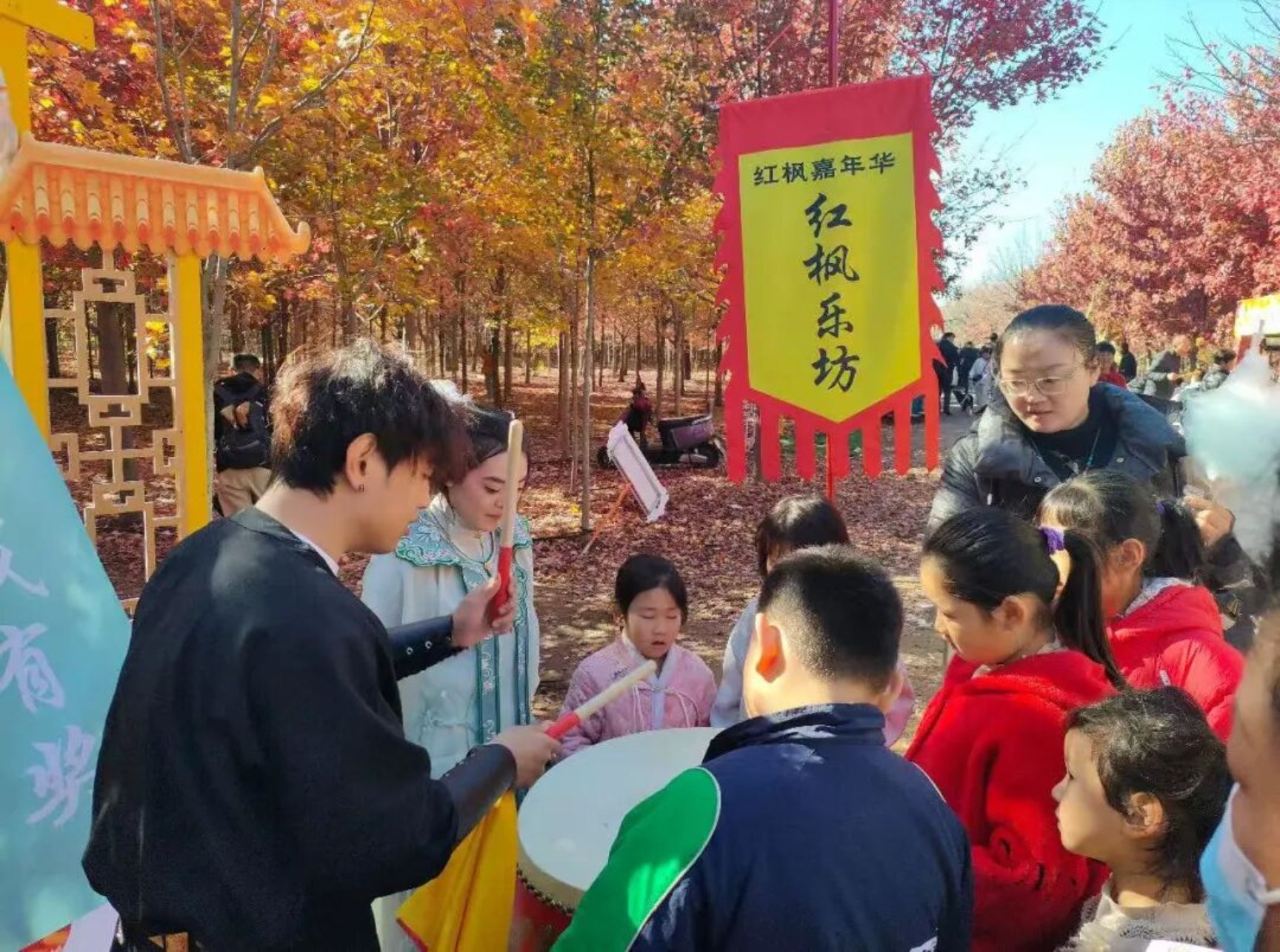 本届红枫嘉年华由莱西市文联、莱西市女书画家协会、夏格庄镇政府联合打造,以“枫韵千年,枫情万种”为主题,融合观赏、学习、游乐等多元体验。作为活动的重要参与力量,美术与艺术设计学院学子围绕非遗文化传承、文体活动服务两大板块深度参与,将专业所学与传统文化、自然美学紧密结合,成为现场一道亮眼的青春风景线。