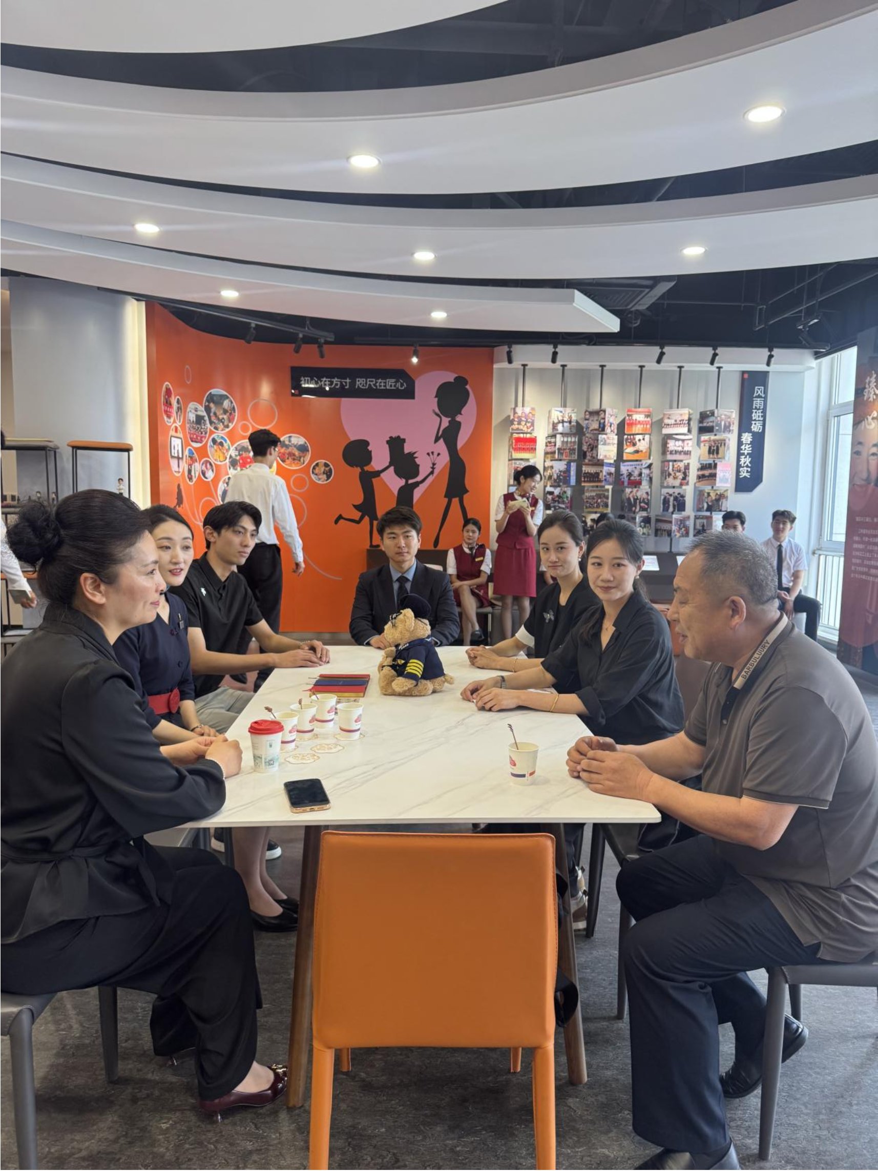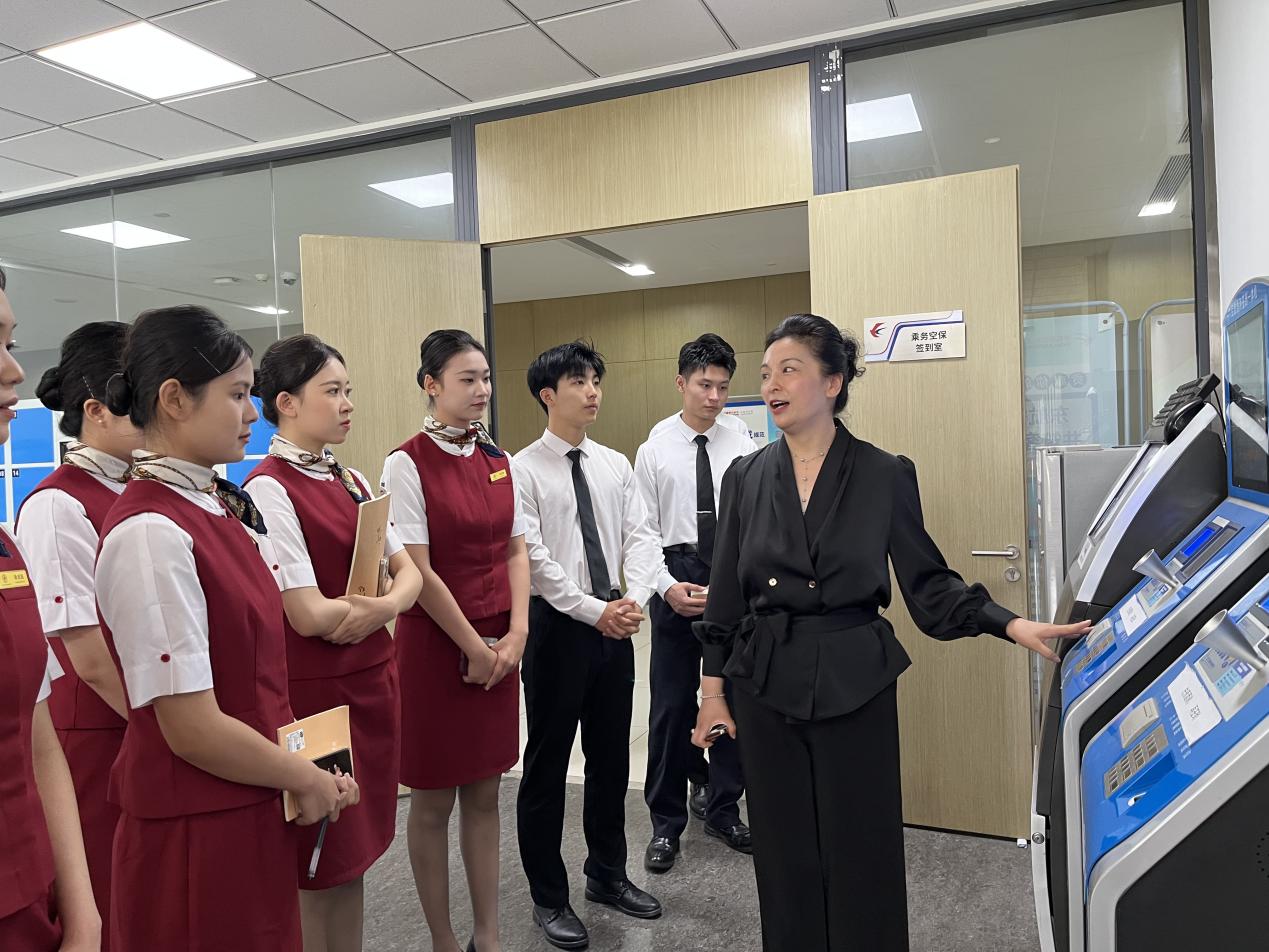 在王慧创新工作室里,“东方日出,再次起航”的标语振奋人心。在这间充满故事的工作室里,王慧用亲身经历讲述了由流亭机场至胶东机场的转场历程,一次次应急医疗事件,一场场平常但不平凡的航班故事,表达着民航人对于蓝天的深切情节与诚挚的情感,更凝聚着东航在服务创新、人才培养上的探索以及在社会服务方面的责任感。同学们认真参观工作室成果,与乘务教员交流合照,了解其在乘务技能提升、服务模式创新等方面的实践,直观感受行业前沿动态,为职业技能打磨锚定方向。